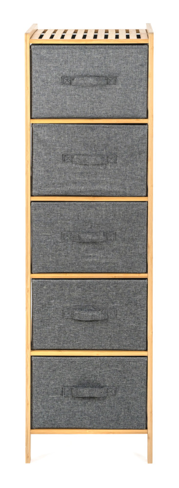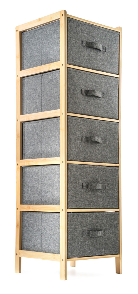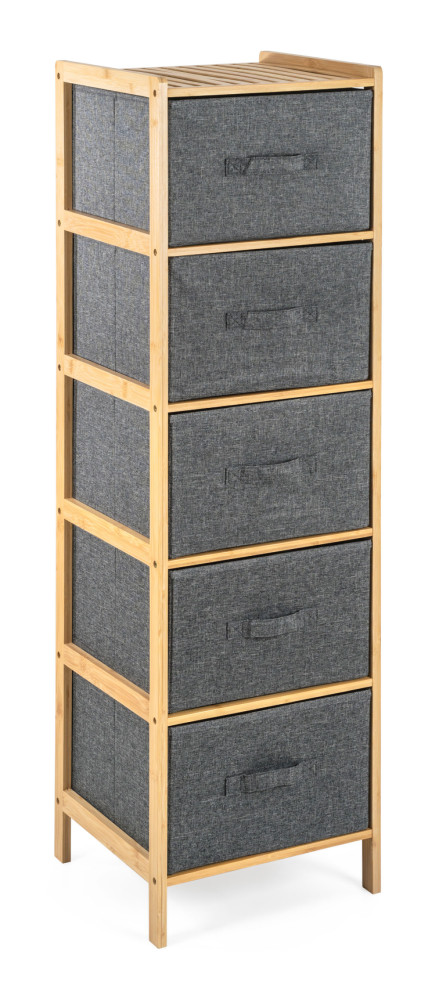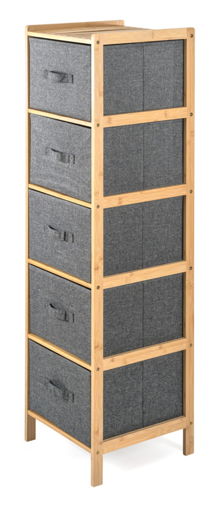 Praktický stojan s 5 výsuvnými textilnými košíkmi ušetrí veľa miesta a uložíte doň všetko, čo potrebujete. Potreby na pranie alebo kozmetiku, oblečenie aj detské hračky. Každý košík má objem 21 litrov, šírka je 33 cm, výška 19 cm a hĺbka 35 cm. Celý stojan má výšku 1,20 m.