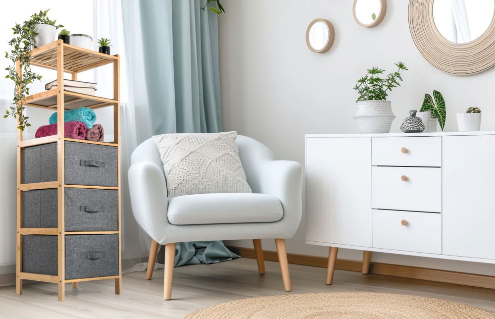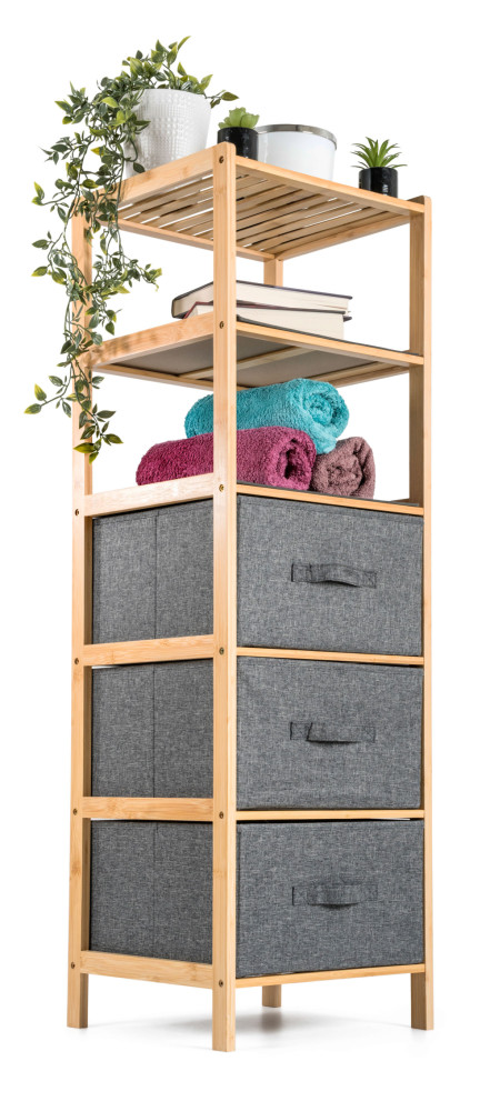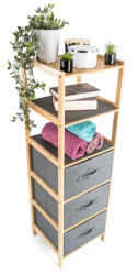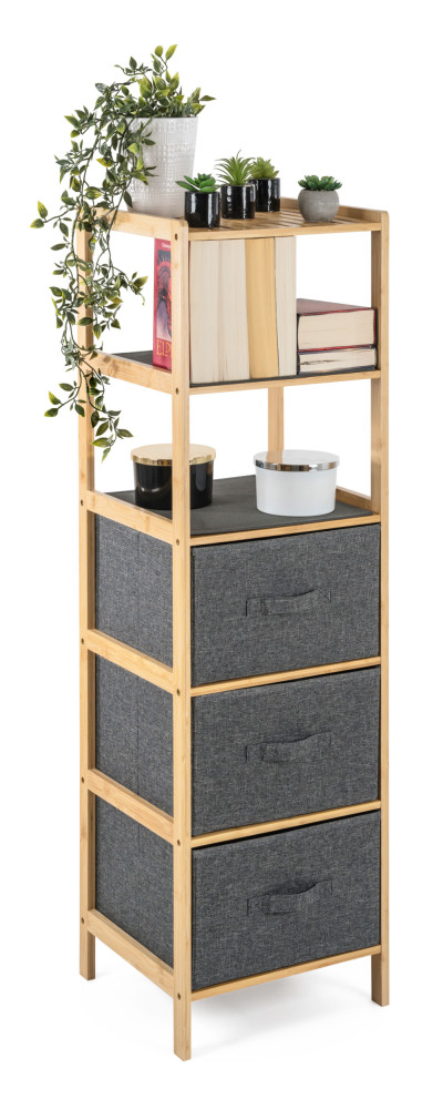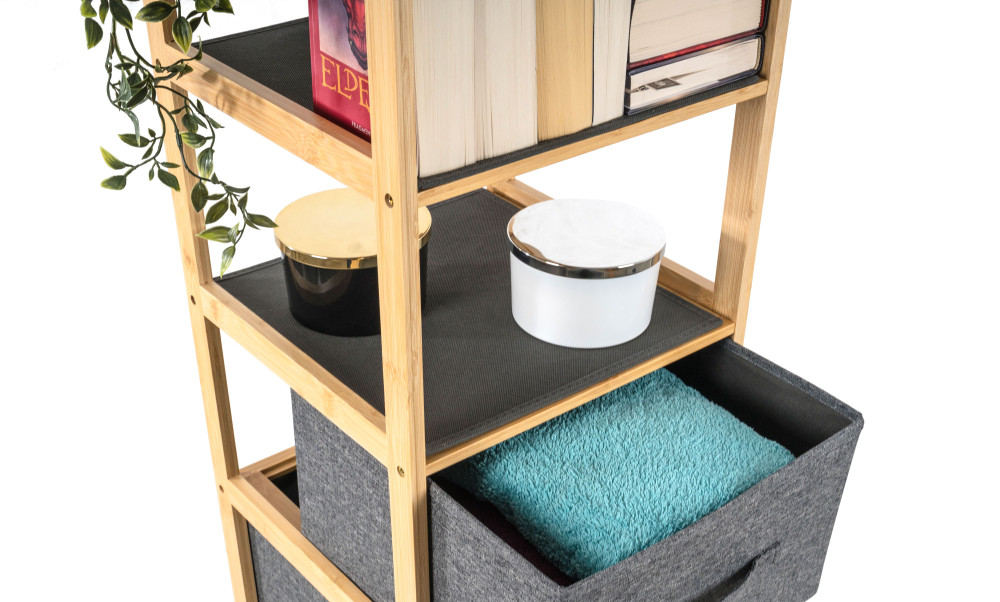 Bambusový regál s výsuvnými látkovými zásuvkami dodáva interiéru príjemný prírodný dojem, pocit ľahkosti a prirodzenosti, zatiaľ čo jeho pevnosť a dlhá životnosť zaisťujú stabilitu a trvanlivosť.