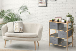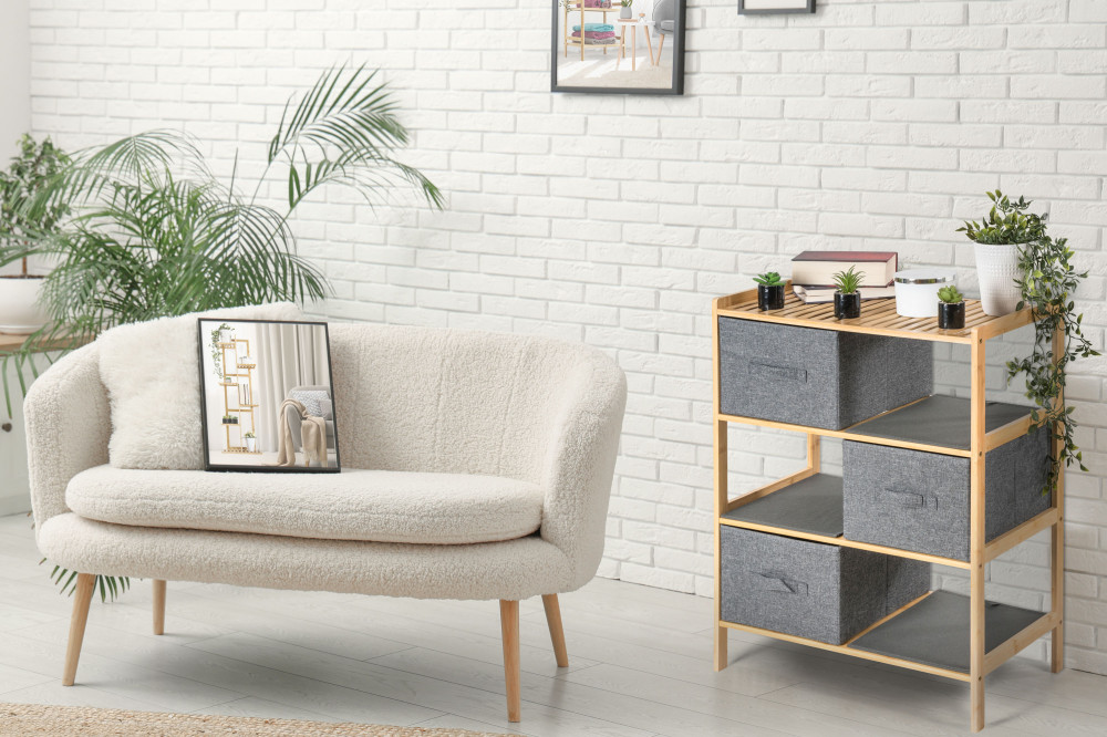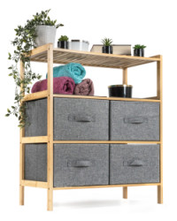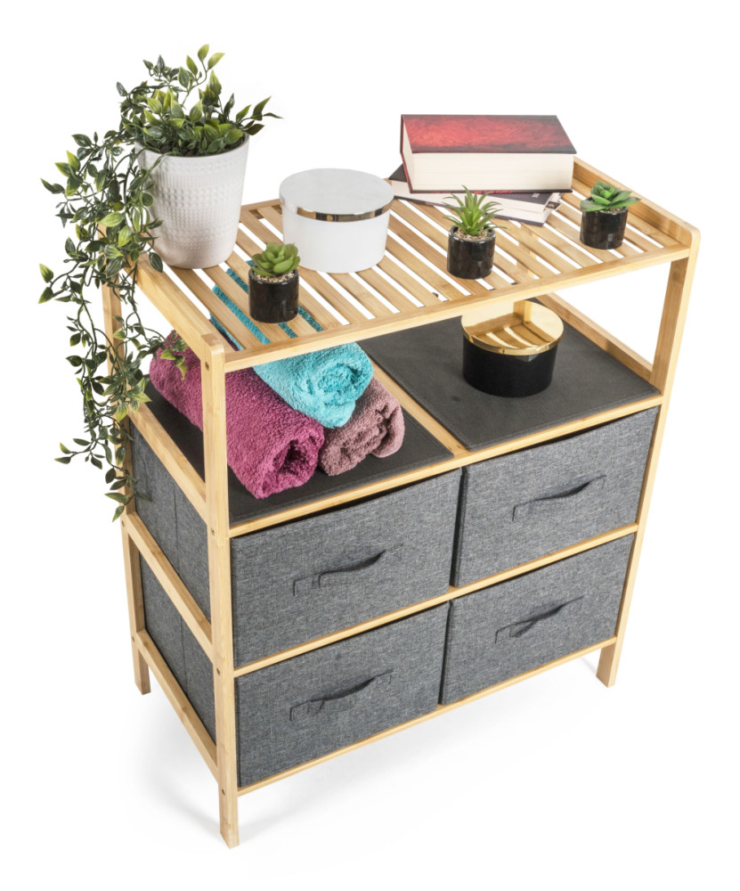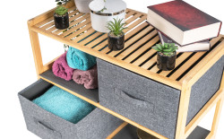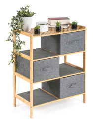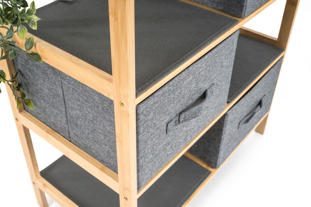 Bambusový regál s výsuvnými látkovými zásuvkami dodáva interiéru príjemný prírodný dojem, pocit ľahkosti a prirodzenosti, zatiaľ čo jeho pevnosť a dlhá životnosť zaisťujú stabilitu a trvanlivosť.