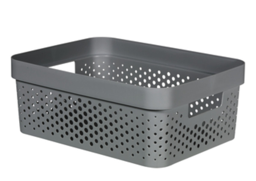 Tento štýlový a praktický box sa vyrába zo 100% recyklovaného plastu. Je teda šetrnejšie k životnému prostrediu. Box má všetky steny perforované malými dierkami. Je teda ideálny pre všetky predmety, ktoré pri skladovaní potrebujú prúdenie vzduchu. Na kratších stenách sa nachádzajú dve madlá. Využijete ich na prenášanie boxu. Navyše doplní vybavenie kuchyne, obývacej izby, spálne aj kúpeľne.