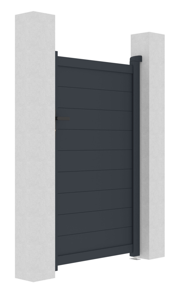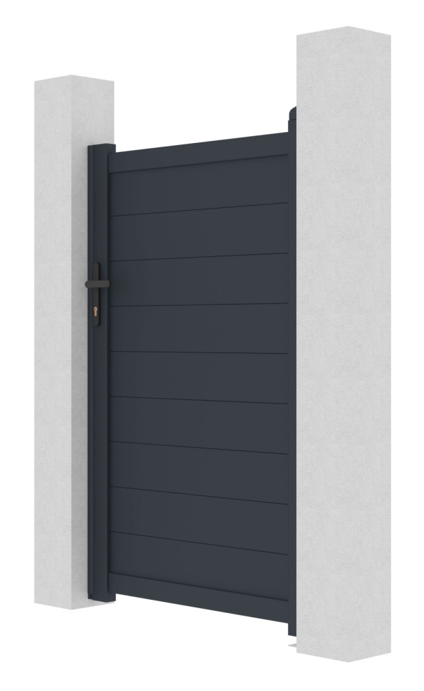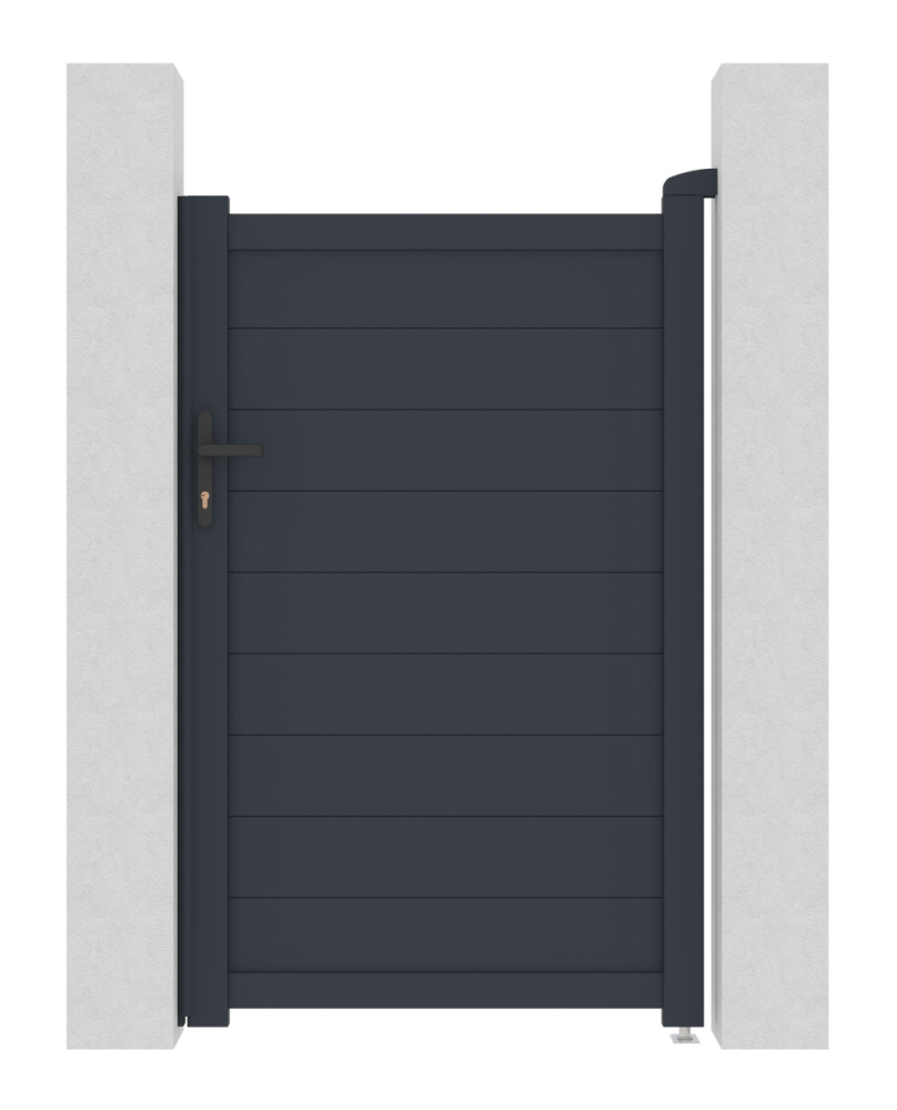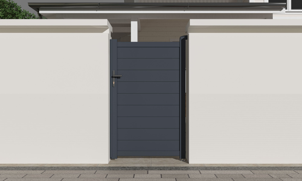 Výplň s horizontálne uloženými lamelami v atraktívnom grafitovom prevedení kombinuje dostatok súkromia s moderným dizajnom, takže bránka s otváraním dovnútra pristane každému typu oplotenej stavby.