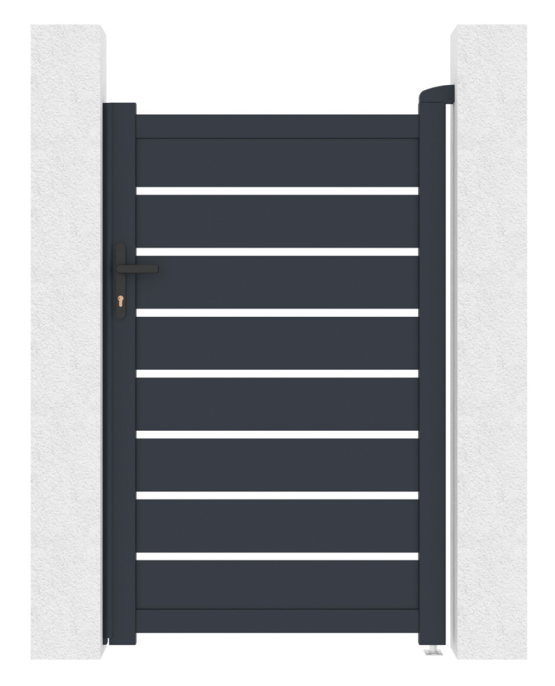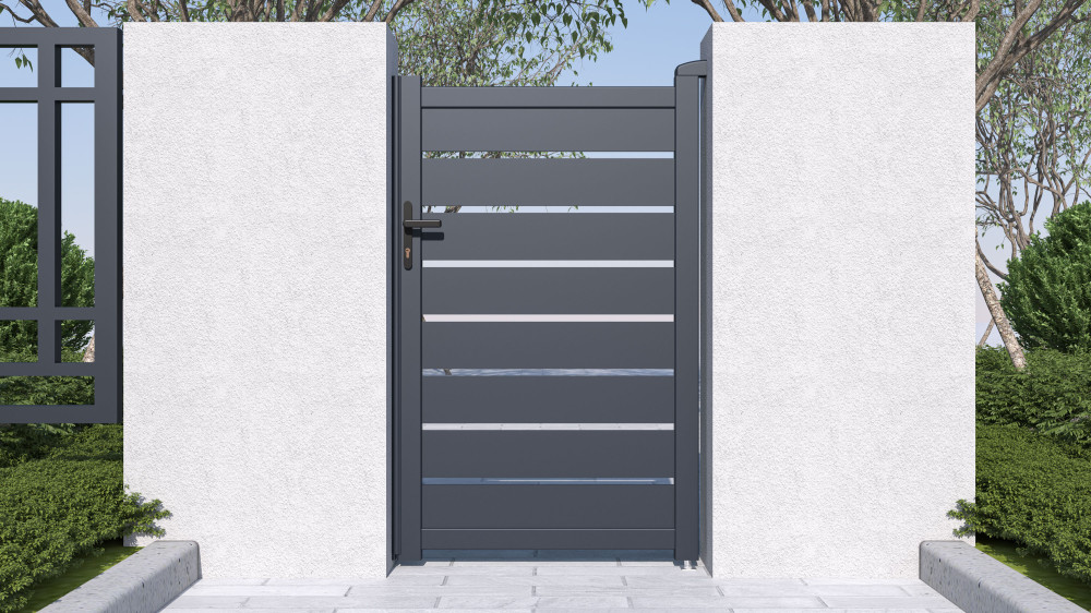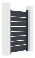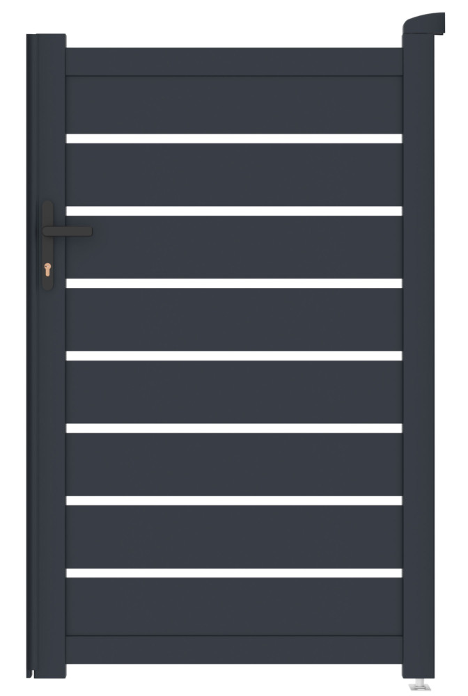 Výplň s horizontálne uloženými lamelami v atraktívnom grafitovom prevedení kombinuje dostatok súkromia s moderným dizajnom, takže bránka s otváraním dovnútra pristane každému typu oplotenej stavby.