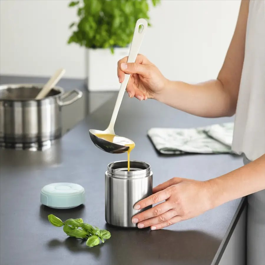 Dvojitá stena nádoby je vybavená vákuovou technológiou, aby dokázala udržať teplotu jedla po dlhú dobu. Polievka zostane horúca až na 6 hodín, zatiaľ čo chladené pochúťky budú studené približne 9 hodín. Pred naplnením vypláchnite nádobku horúcou alebo ľadovo studenou vodou podľa druhu potraviny, ktorú do nej chcete vložiť. Umyjete ju v umývačke na riad. Uzáver však očistite ručne, aby nedošlo k jeho poškodeniu.