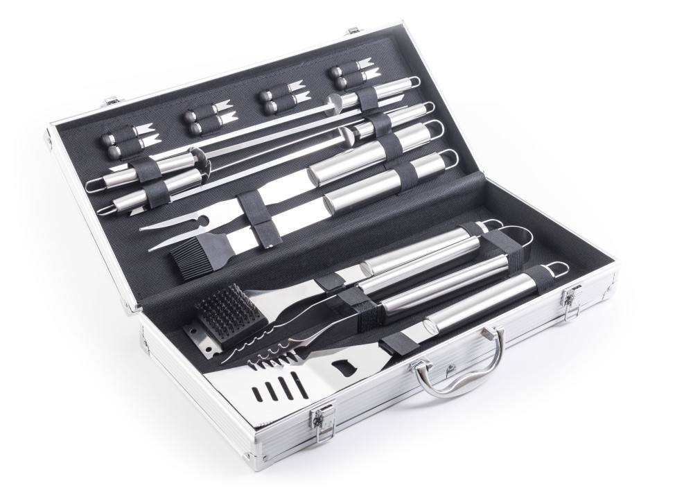 Sada obsahuje kompletné nástroje pre grilovanie bez ťažkostí. Súčasťou sady je obracačka, vidlička, kliešte, štetec na potieranie, čistiaca kefa, napichovátka pre ľahké jedenie klasov kukurice a grilovacie ihlice na výrobu špízov. Dĺžka náradia 40 cm zaisťuje, že na vás pri grilovaní nebudú šľahať plamene ani prskať olej z mäsa. Pre jednoduché prenášanie a skladovanie je náradie uložené do praktického hliníkového kufra.