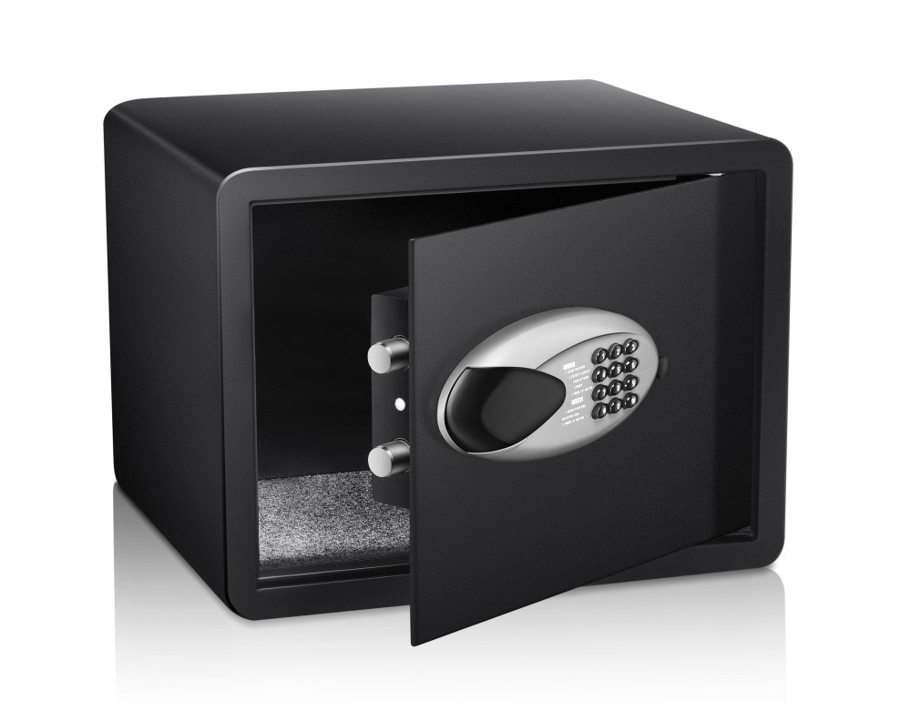Na bezpečné uzatvorenie je trezor vybavený digitálnym zámkom s číselnou kombináciou a informačným LED displejom. S pomocou priloženého návodu si jednoducho nastavíte vlastný 6-miestny kód. Na digitálnom zámku trezora je možné tiež nastaviť dátum a čas. Na displeji je potom možné v prípade potreby skontrolovať až 105 záznamov o otvorení trezoru. Na núdzové otvorenie trezora sú okrem digitálneho zámku dvierka vybavené aj mechanickým zámkom na kľúč. V balení nájdete 2 kľúče pre prípad, že by ste jeden z kľúčov stratili, alebo chceli umožniť prístup do trezoru ďalšej osobe.