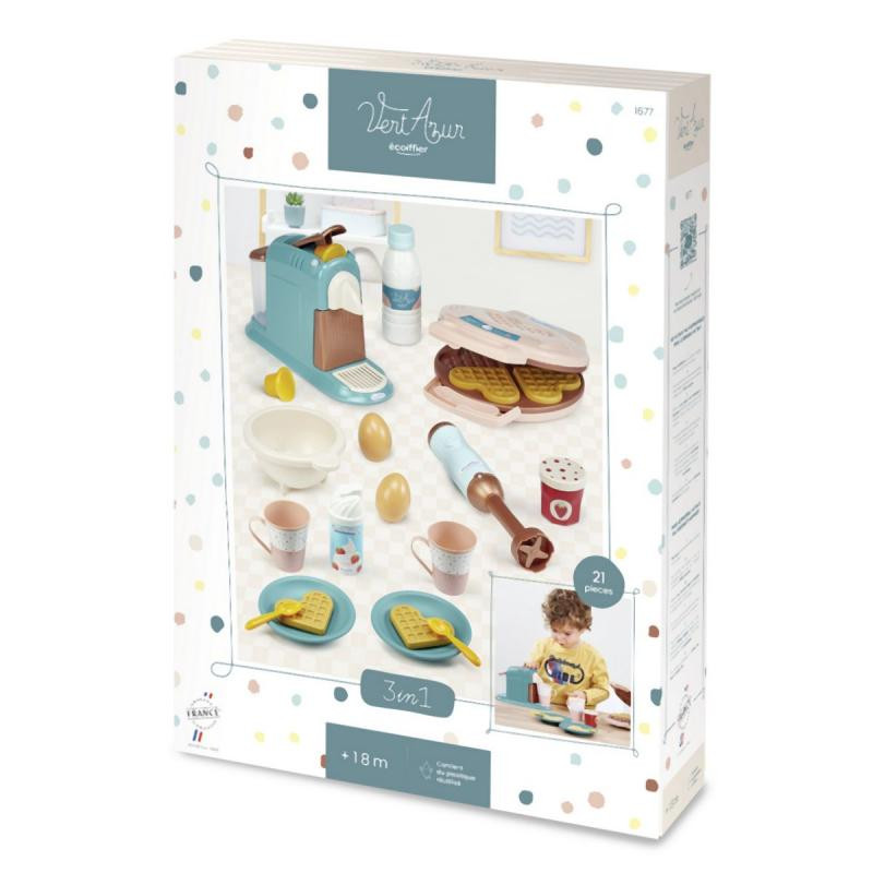 Deti sa vďaka tejto sade môžu hrať na prípravu raňajok rovnako ako dospelí. V balení nájdu nielen tri kuchynské spotrebiče, ale aj množstvo doplnkov, s ktorými si užijú hodiny zábavy. Set je ideálny už od 18 mesiacov a prispieva k rozvoju detskej predstavivosti aj jemnej motoriky. Výrobok je súčasťou radu VertAzur, ktorý sa zameriava na kvalitné a bezpečné hračky na každodenné hranie.