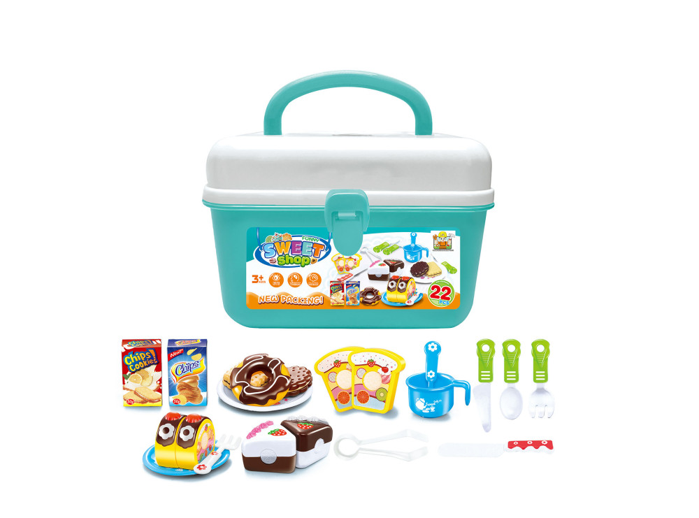 V kufríku nájdete krásne farebné plastové tortičky, donuty, rolády, škatuľky s ingredienciami, riad i príbory. Skrátka všetko, čo je v cukrárni potreba. Súčasťou kufríka je tiež držadlo, vďaka ktorému môže mať vaša ratolesť svoj obchodík s tortičky pri sebe i na cestách.