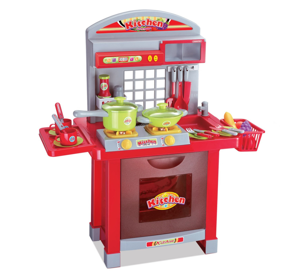 Kuchynka má rúru, dve platničky na varenie, drez, odkladaciu plochu, vešiak na kuchynské náčinie a mnoho ďalšieho príslušenstva. V balení nájdete napríklad hrnce, taniere, hrnčeky, príbory, ovocie, zeleninu a koreničky.