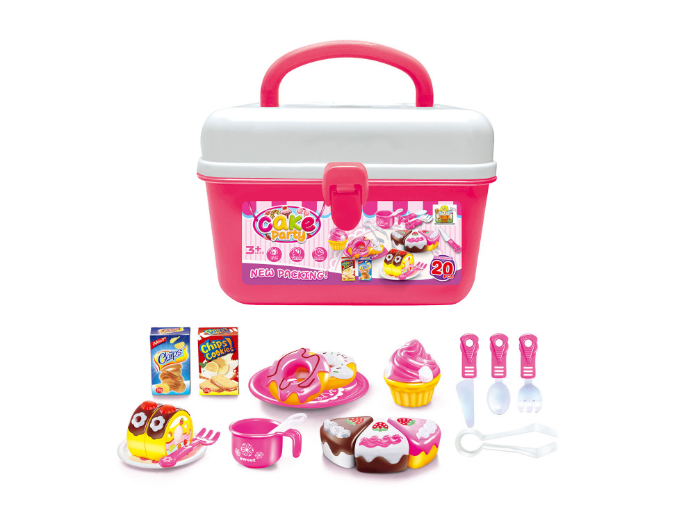 V kufríku nájdete krásne farebné plastové tortičky, donuty, rolády, škatuľky s ingredienciami, riad i príbory. Skrátka všetko, čo je v obchodíku s dobrotami potreba. Súčasťou kufríka je tiež držadlo, vďaka ktorému môže mať vaša malá cukrárka svoj obchodík s tortičkami pri sebe i na cestách.