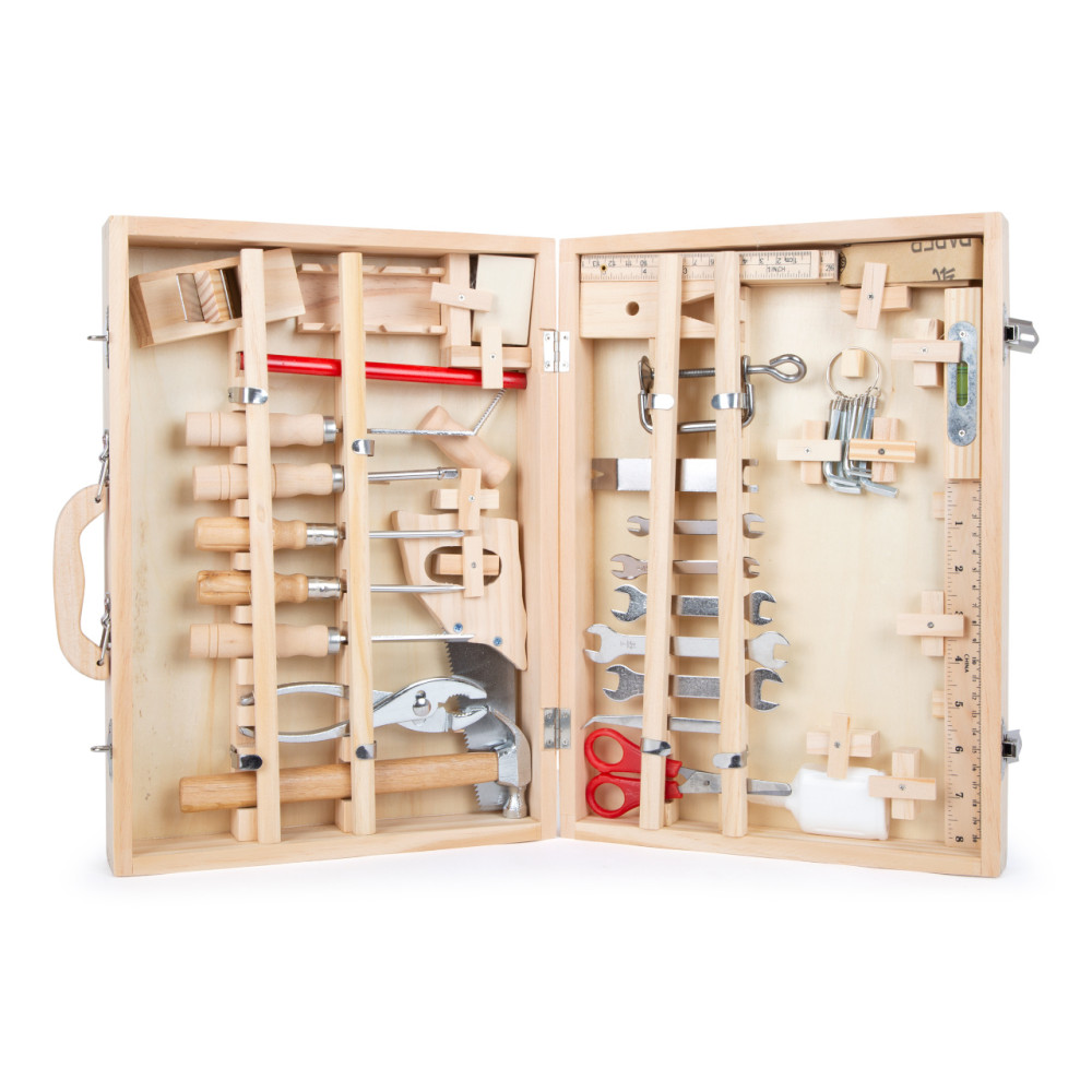 Zaujíma sa vaše dieťa o to, na čom práve pracujete v dielni? Zaobstarajte mu vlastný kufrík s náradím od značky Small Foot. Všetko náčinie sa vyrába z dreva, kovu a plastu. Súčasťou balenia je celkom 48 dielov – kľúče, píla, nožnice, dláto, tesárska ceruzka, šesťhranný kľúč alebo napríklad kladivo. S ich pomocou sa malý domáci majster pustí do rôznych opráv a prác.