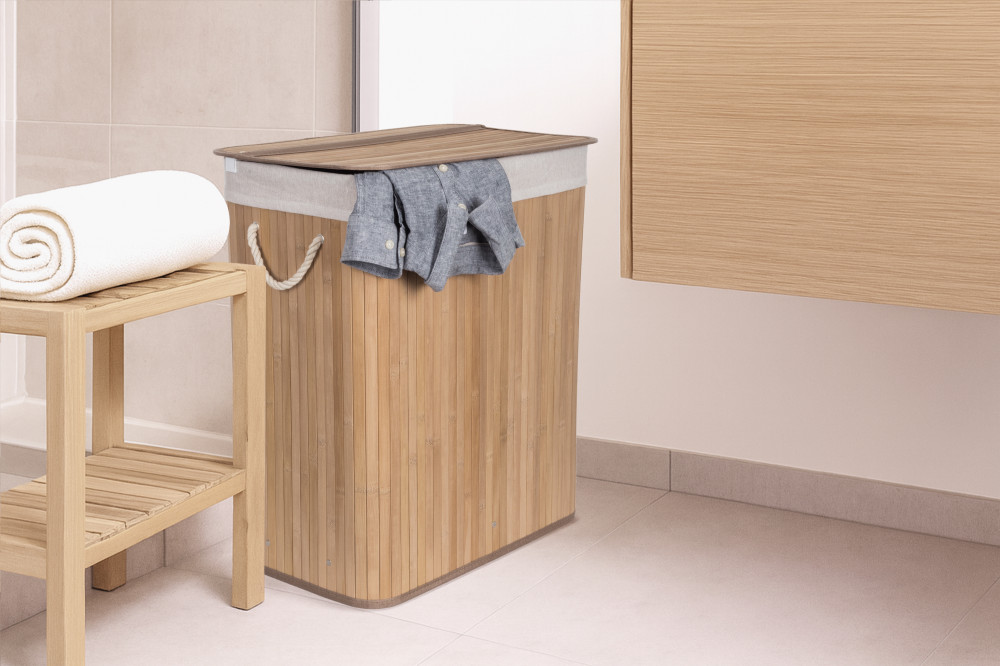 Ako vybrať najlepší kôš na špinavú bielizeň? Čo sa týka materiálu koša, odporúčame jednoznačne bambus. Je odolný voči vlhkosti, takže ho môžete bez obáv umiestniť do kúpeľne alebo servisnej miestnosti s práčkou. Zároveň je aj vizuálne veľmi príjemný – kombinácia prírodného materiálu a farebne zladenej vložke a držadlám evokuje pocit čistoty, navyše sa aj hodí k akémukoľvek interiéru.