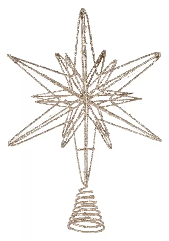Špička na stromček v podobe hviezdy rozžiari každý vianočný stromček príjemným a decentným svetlom. S 20 zabudovanými LED diódami vytvára pôsobivý efekt, ktorý oceníte nielen večer pri rozsvietenom stromčeku, ale aj cez deň ako dizajnový doplnok. Dizajn hviezdy patrí medzi klasické prvky vianočnej výzdoby. Elegantná farba v odtieni champagne so zlatým nádychom prináša do interiéru jemný lesk a slávnostný nádych. Výška 33 cm zaručuje, že špička bude na stromčeku krásne viditeľná a vkusne dominantná.