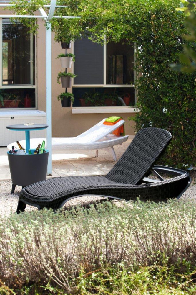 - Tmavo hnedé záhradné lehátko s designom prírodného ratanu