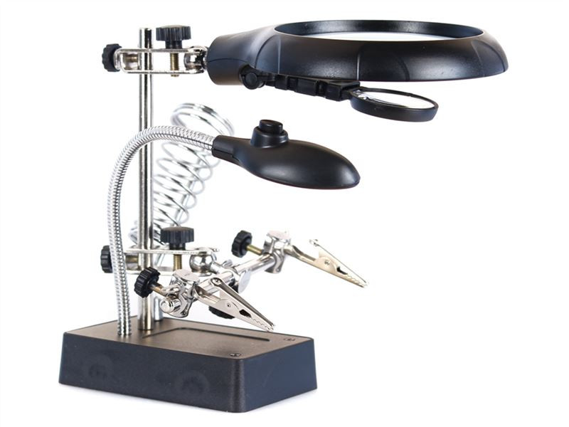 Základňa na stole nezaberie veľa miesta a pritom skrýva všetko potrebné vybavenie. Stabilná konštrukcia zabraňuje prevráteniu. Používajte ju k oprave drobných technických položiek a k jemnej detailné prácu. Osvetlenie na ohybnom krku umožňuje nasmerovať svetlo presne na požadovanú oblasť.