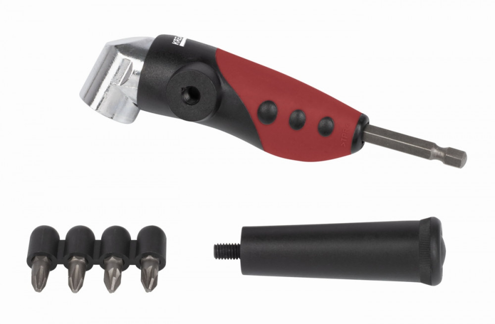 Uhlový držiak bitov KRT063700 je dodávaný s dvoma bitmi PH2 a dvoma bitmi PZ2 z CRV ocele a adaptérom 1 ". Súčasťou balenia je aj prídavné držadlo pre ľahšiu prácu.