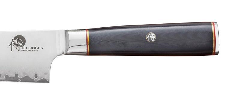 Na výrobu rukoväte noža Dellinger sa používa veľmi kvalitný materiál G-10. Udrží si svoju tvrdosť a pevnosť. Rukoväť zdobí stredový mozaikový nit so znakom samuraja. Ten zároveň zaisťuje jej pevné spojenie s ostrím. Rukoväť je vyvážená a ergonomicky tvarovaná, takže sa vám nôž pohodlne drží v ruke.