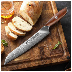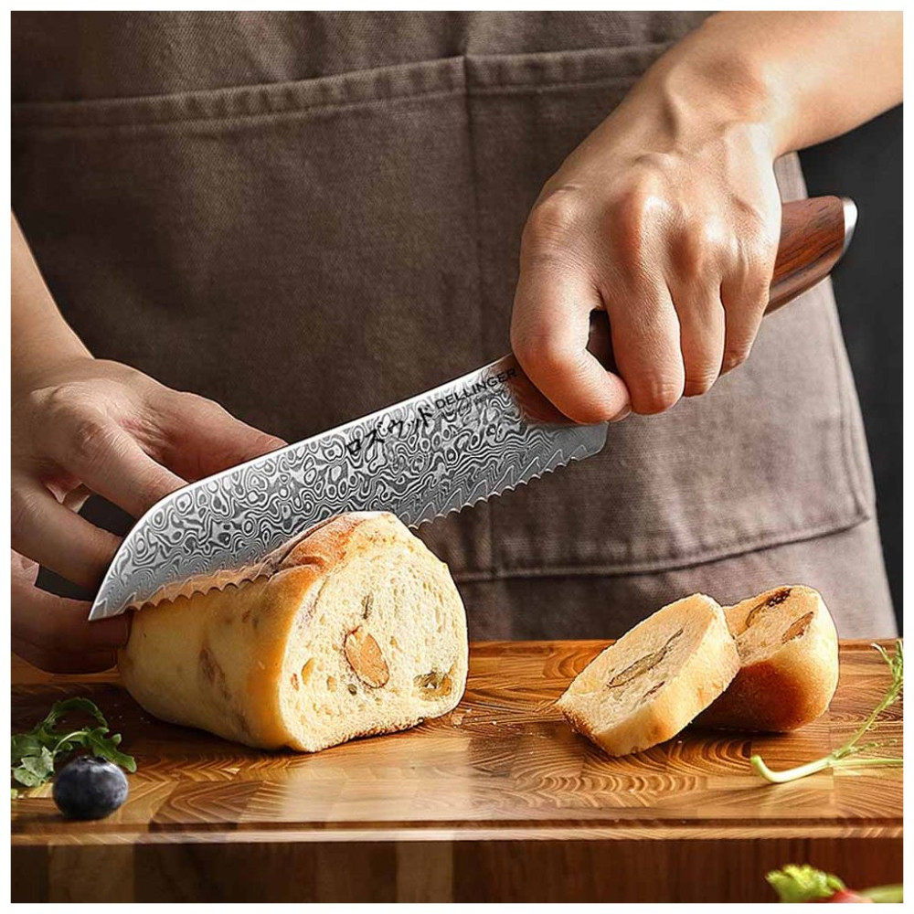 Dellinger Bread Rose Wood Damascus® je nôž s 210 mm vrúbkovanou čepeľou, ktorý si hravo poradí s pečivom, tortami aj ovocím s tvrdou šupkou. Čepeľ z japonskej ocele VG10 obklopená 66 vrstvami damaškovej ocele zabezpečí čistý rez bez drobenia a deformácie.