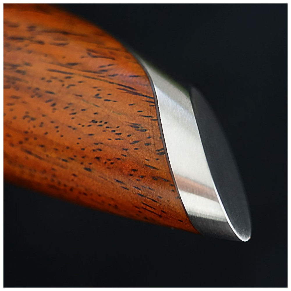 Rukoväť z prírodného dreva Rose-Wood spája estetiku a funkčnosť. Je príjemná do ruky, ergonomicky tvarovaná a doplnená dekoratívnym stredovým nitom. Každý kus má unikátnu kresbu a vďaka perfektnému vyváženiu ponúka stabilné a pohodlné krájanie. Rose-Wood symbolizuje luxus a dlhovekosť – ideálny pre náročných používateľov aj zberateľov.