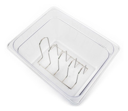 Stojan G21 pre sous-vide kontajner drží jednotlivé porcie so zavakuovanými surovinami oddelene a umožňuje tak plynulú cirkuláciu vody okolo balíčkov. Vďaka tomu je sous-vide varenie rovnomerné a príprava sous-vide špecialít je efektívnejšia a lepšia ako pri voľnom položení balíčkov na seba alebo rozložení na dno. Sous-vide stojan G21 svojim riešením zabraňuje dotyku jednotlivých balíčkov medzi sebou alebo so stenami nádoby pre sous-vide varenie.