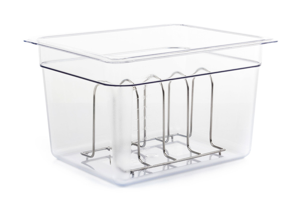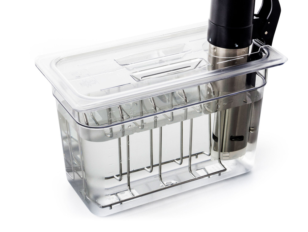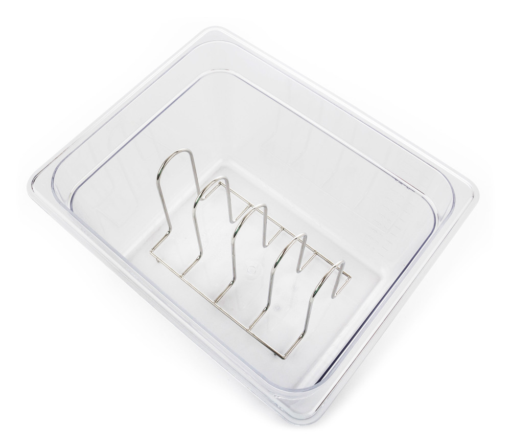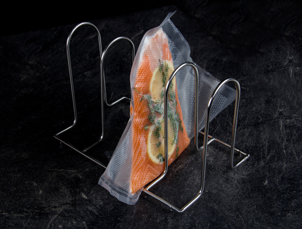 Vyskúšajte praktický doplnok pre sous-vide varenie. 4-miestny stojan do kontajnerov a nádob na varenie metódou sous-vide zachová odstup medzi zavakuovanými balíčkami s mäsom a ďalšími surovinami.