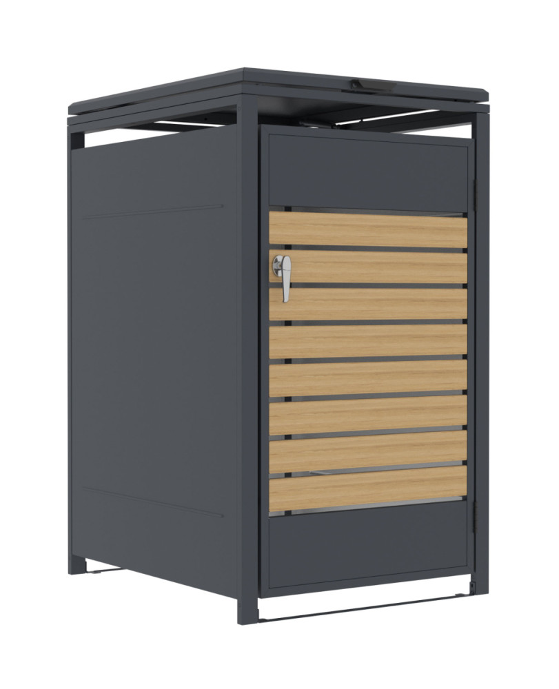 Kombinácia modernej antracitovej farby a dekoru dreva vytvára vizuálne atraktívny celok, ktorý skvele doplní modernú novostavbu aj tradičný vidiecky dom. Vďaka kompaktným rozmerom sa zmestí aj do menších priestorov pri vstupe alebo pozdĺž plotu. Pomocou prístrešku elegantne skryjete nevzhľadné plastové nádoby na odpad a prispejete tak k celkovému upravenému vzhľadu okolia domu.