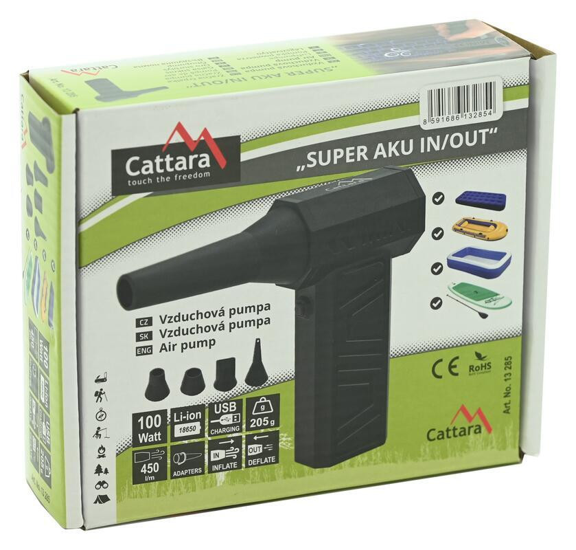 Pumpa Cattara SUPER AKU je navrhnutá tak, aby zvládla širokú škálu úloh. S priloženými nástavcami hravo nafúknete aj vyfúknete matrace, člny, paddleboardy alebo bazény. Vďaka motoru, ktorý dosahuje až 100 000 otáčok za minútu, však prístroj slúži aj ako účinný ofukovač. Ľahko tak vyčistíte klávesnicu počítača, vnútro elektroniky alebo vyfúkate prach z ťažko prístupných miest v aute.