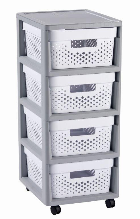 Biele boxy v svetlo šedom regále Infinity Dots značky Curver sú vyrobené zo 100% recyklovaného plastu. Štyri prepravky s objemom 11 litrov sa nachádzajú vo svetlo šedom stojane na kolieskach. Praktické dizajnovo prepracované boxy vám pomôžu udržať poriadok doma, v dielni alebo napríklad aj na záhrade.