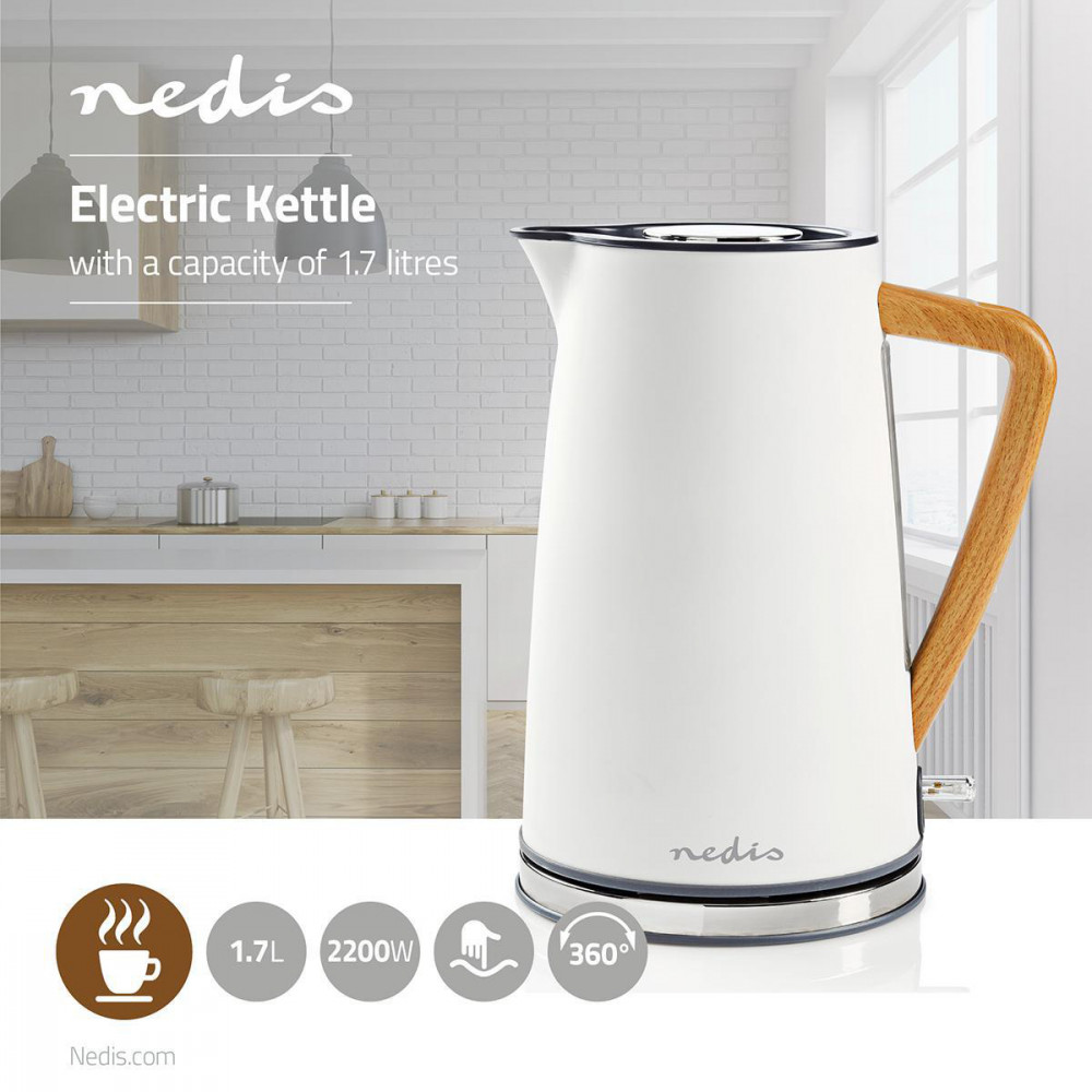 Elektrická rýchlovarná kanvica značky Nedis® s objemom 1,7 l funguje rovnako skvele, ako vyzerá. Nadčasový severský dizajn v kombinácii bielej farby a dreva vykúzli útulnú atmosféru aj vo vašej kuchyni. Vneste trochu hygge štýlu do svojho domova.