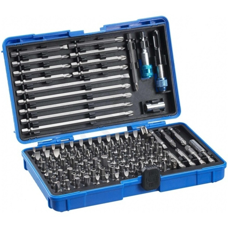 Pevný plastový zakladač s dlhou životnosťou leží v robustnej odolnej kazete s poistným zámkom, ktorý zabraňuje samovoľnému otvoreniu. V sade nájdete bity C6.3 (25 mm), bity E6.3 (50, 75, 150 mm), špeciálne bity na utiahnutie / povolenie hákov a magnetické držiaky bitov.