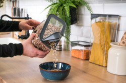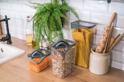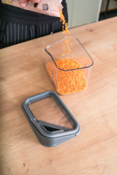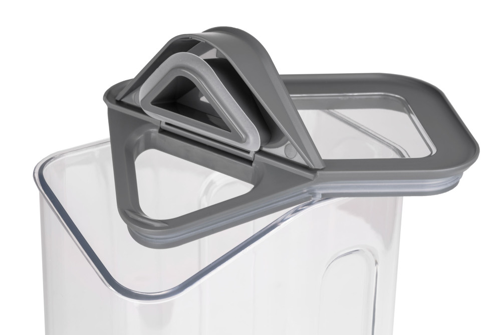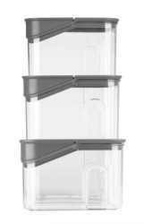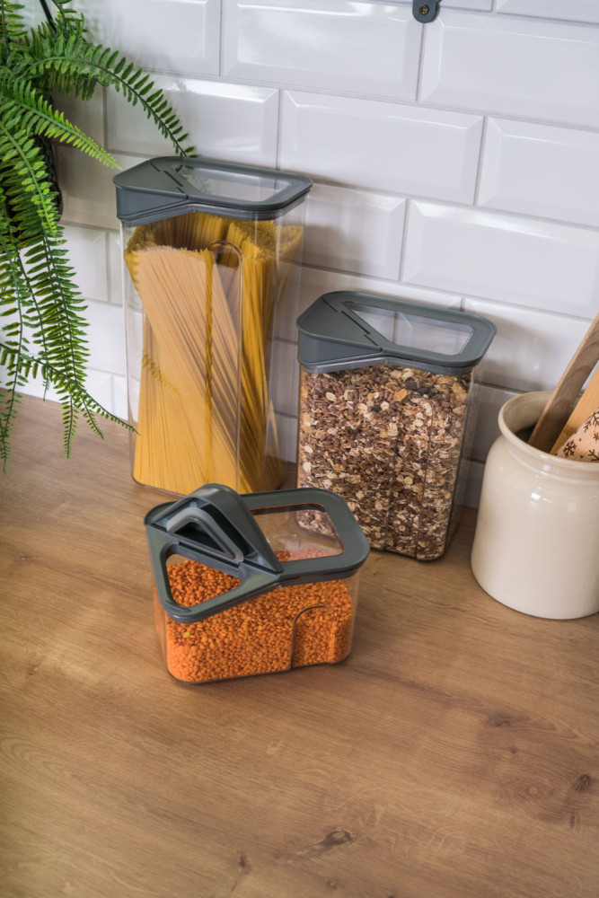 Dózy G21 využijete pri skladovaní múky, cestovín, ryže či sušeného ovocia. Vďaka trom rôznym objemom si jednoducho usporiadate špajzu alebo chladničku podľa aktuálnych potrieb. Vzduchotesné viečko pomáha udržať potraviny dlhšie čerstvé, zatiaľ čo výklopný roh s násypkou umožňuje presné vysypávanie. Plast neobsahuje BPA, preto sú dózy 100 % bezpečné pre potraviny. Vďaka stohovateľnému tvaru ich ľahko uložíte jednu na druhú.