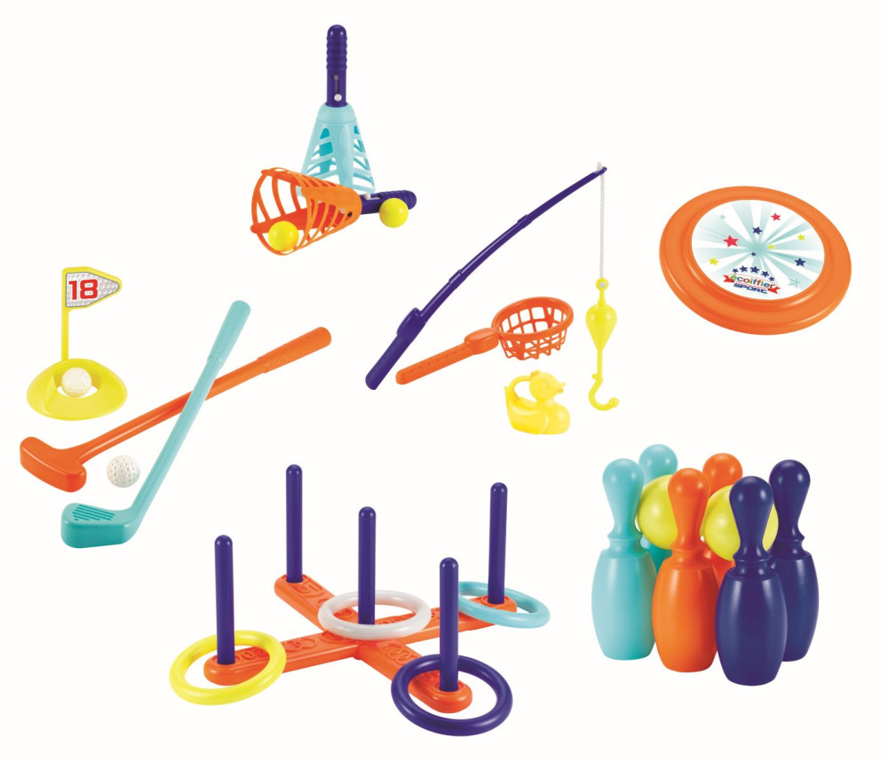 Zaobstarajte svojim deťom sadu Ecoiffier. Obsahuje celkom 6 hier – frisbee, chytanie rybičiek, golf, chyť loptičku, krúžky na kríž a kolky. Váš potomok sa zabaví vo vnútri aj vonku. Záleží, kam si sadu prenesie. Všetky diely sa vyrábajú z plastu. Hry sú vhodné pre deti od 3 rokov.