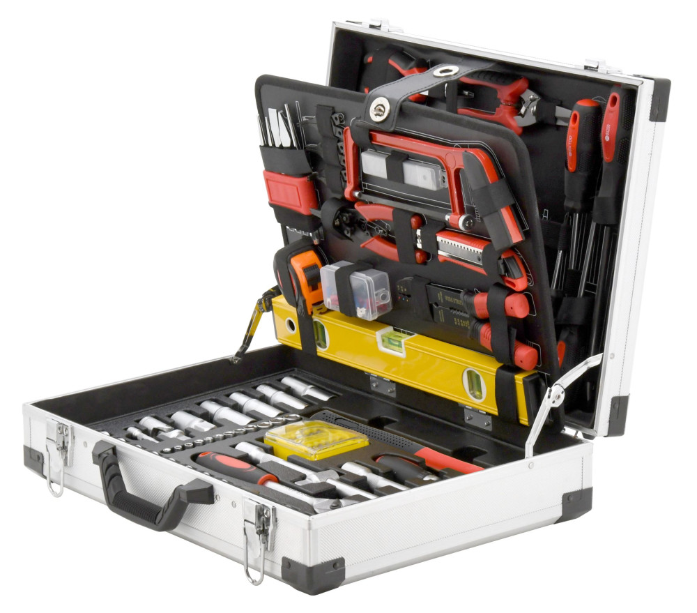 Vo vrchnej časti kufra so zabudovaným organizérom nájdete skrutkovače rôznych rozmerov a elektrikársku skúšačku. Tiež sa tu nachádzajú najbežnejšie používané kliešte, vrátane kombinovaných, štípacích a strihacích. Kufor s ergonomický tvarovanou rukoväťou tvorí hliníková konštrukcia s kovovými rohmi a sponami pre bezpečné uzatváranie.