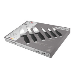 6 kvalitných nožov využijete na rozrezávanie a krájanie rôznych potravín. Nájdete medzi nimi kuchársky a úžitkový nôž, 2 nože Santoku, nôž na okrajovanie a nôž na chlieb.Elegantný dizajn kolekcie Matte Black doplní každú kuchyňu.