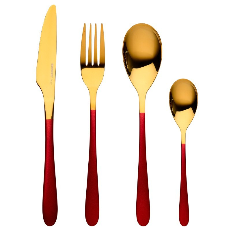 16dielna sada príborov kolekcie Lisboa sa skladá zo 4 stolových nožov 23,5 cm, 4 stolných vidličiek 21 cm, 4 polievkových lyžíc 21,5 cm a 4 čajových lyžičiek 14 cm. Vyrobené z vysoko kvalitnej odolnej nerezovej ocele s lesklým zlatým PVD povrchom a červeno lakovanou rukoväťou. Sada príborov, ktorá je nielen mimoriadne funkčná, ale tiež prináša na stôl dotyk odlišnosti a dobrého vkusu. Jednoduché čistenie, odporúčame ručné čistenie pre predĺženie životnosti produktu.