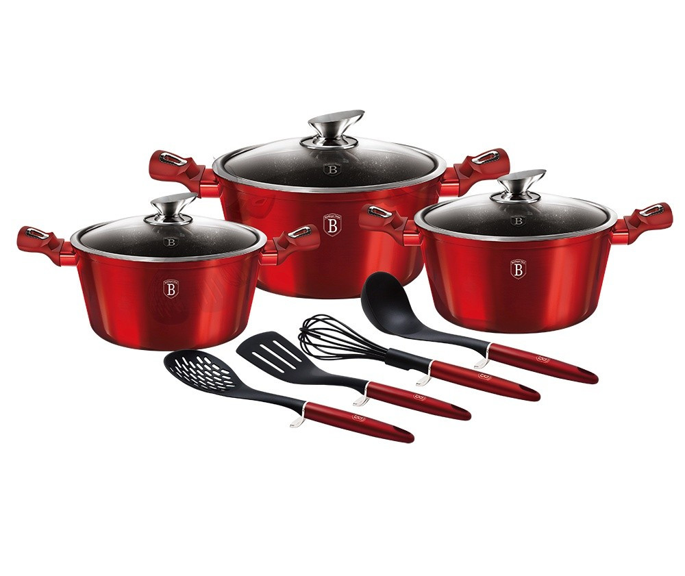 Krásna sada riadu značky Berlingerhaus edície Burgundy Metallic Line sa skladá celkom z 10 kusov riadu a kuchynského náčinia. Riad v elegantnom dizajne má 3vrstvový mramorový povrch, ktorý je charakteristický svojou dokonalou nepriľnavosťou. Pripravované potraviny sa nepripaľujú a vďaka tomu sa riad veľmi jednoducho čistí. Zároveň je vhodný pre zdravé varenie s minimom tuku alebo oleja a môžete ušetriť až 35 % energie oproti obyčajným nerezovým kastrólom. Vnútorná i vonkajšia vrstva neobsahujú žiadne škodliviny, výsledné pokrmy tak nestrácajú varením svoje vitamíny.