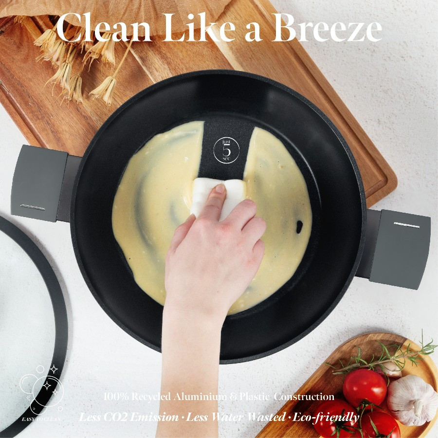 Sada v matném antracitovém provedení skvěle zapadne do každé kuchyně. Kovaný hliník rovnoměrně rozvádí teplo, zatímco poklice z tvrzeného skla s otvorem pro páru umožňují pohodlnou kontrolu při vaření. Ergonomické rukojeti zůstávají chladné na dotek a zajišťují bezpečnou manipulaci.
