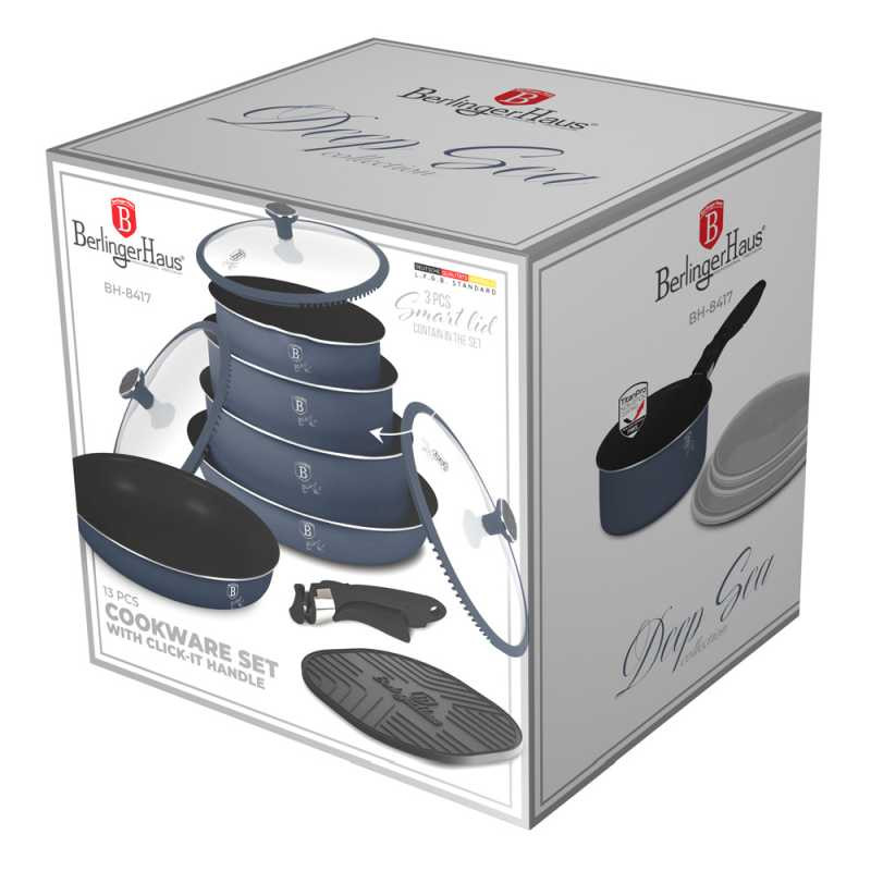 Sada riadu Berlingerhaus Click It XL zo série Deep Sea Collection je vyrobená z kovaného hliníka a vybavená odolným nepriľnavým povrchom TitanPro, ktorý umožňuje varenie s minimom tuku a jednoduché čistenie. Inteligentné pokrievky s parným ventilom a funkciou cezenia uľahčujú každodennú prípravu jedál. Ergonomická odnímateľná rukoväť Click It a mäkký povrch Stay Cool zaručujú pohodlnú manipuláciu bez rizika popálenia. Turbo indukčné dno sa postará o rýchly a rovnomerný ohrev na všetkých typoch varných dosiek. Minimalistický dizajn v modrej a sivej farbe zároveň dodáva vašej kuchyni štýl.