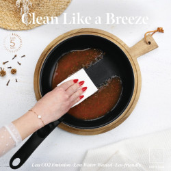 3vrstvý titánový povrch zabezpečuje nepriľnavosť a jednoduché čistenie bez pripaľovania. Turbo indukčné dno rovnomerne rozvádza teplo a urýchľuje prípravu pokrmov. Riad je vhodný pre všetky typy ohrevu a neobsahuje škodlivé látky ako PFOA, olovo ani kadmium.