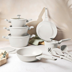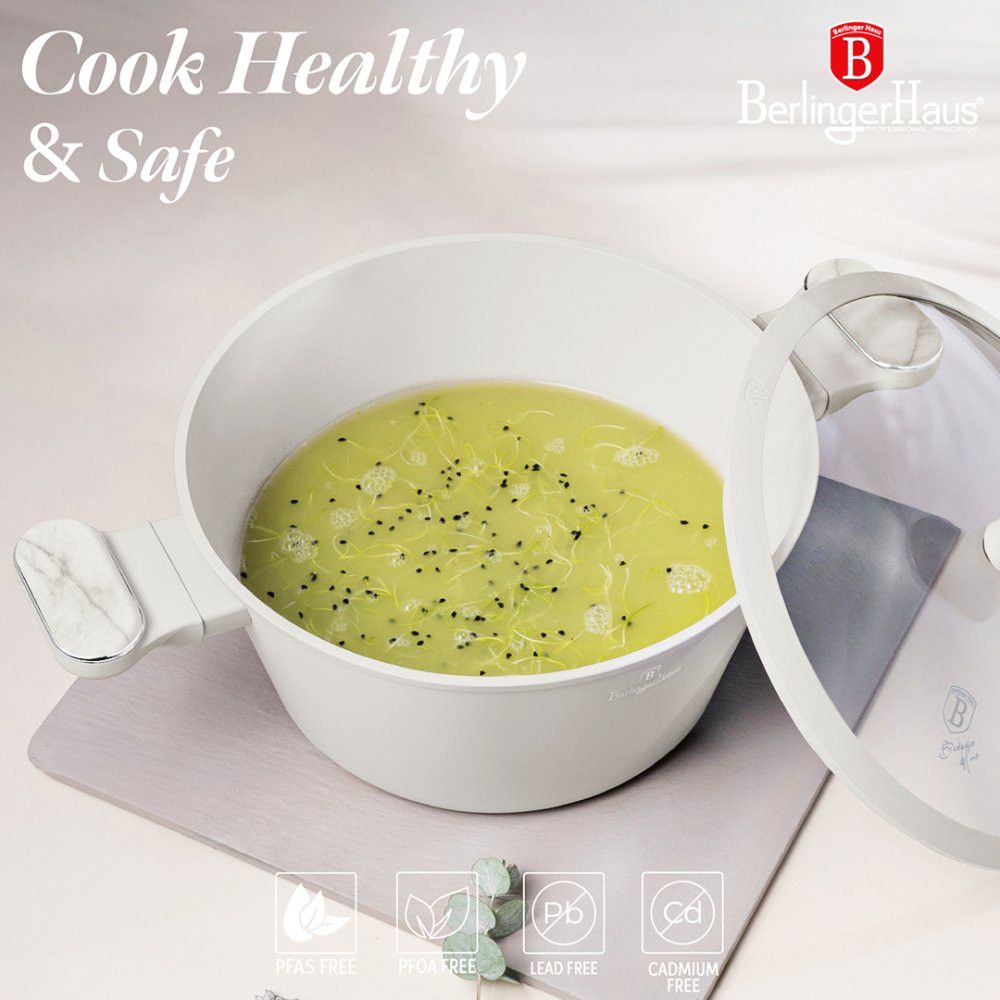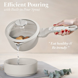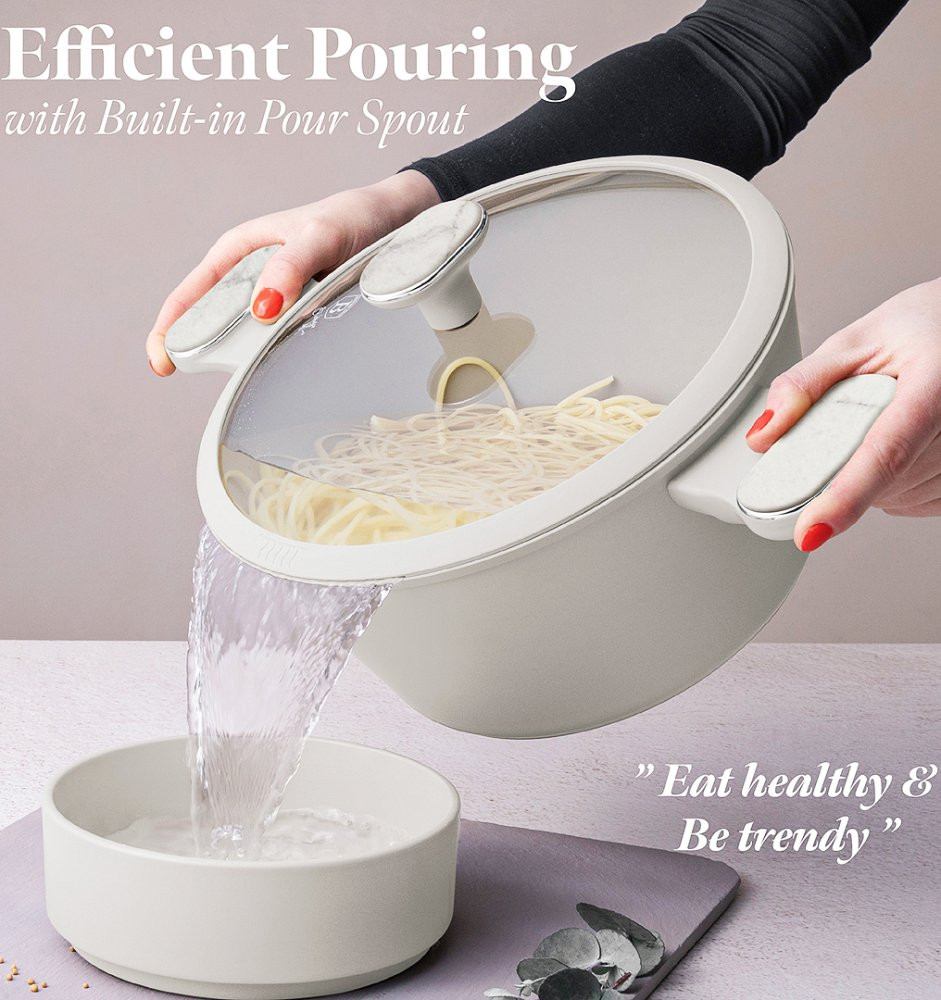 Matné prevedenie v krémovej farbe s mramorovým efektom dodáva riadu nadčasový vzhľad. Ergonomické rukoväte s mäkkým povrchom zostávajú chladné a zabezpečujú pohodlnú manipuláciu. Pokrievky z tvrdeného skla s parným ventilom a silikónovým tesnením umožňujú bezpečné a komfortné používanie.