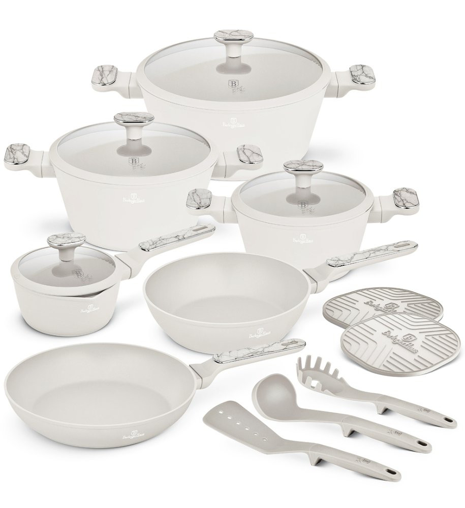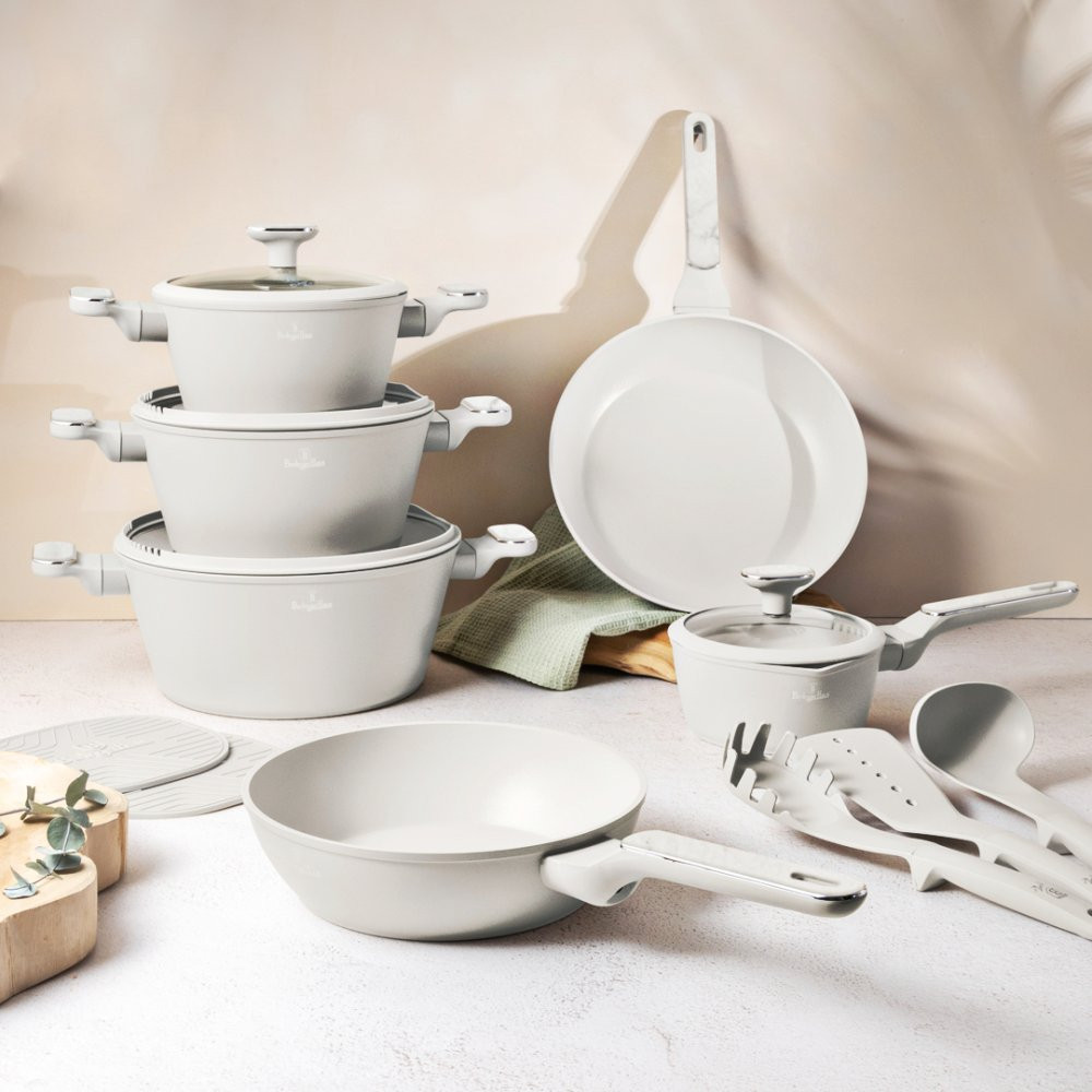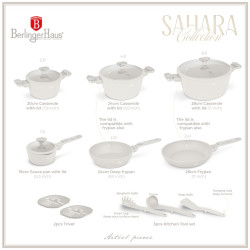 Sada riadu BerlingerHaus Sahara Marble Collection 15 ks spája elegantný mramorový dizajn a vysoký výkon na každodenné varenie. Vďaka titánovému nepriľnavému povrchu a kompletnej výbave zvládnete pohodlne prípravu všetkých typov pokrmov.