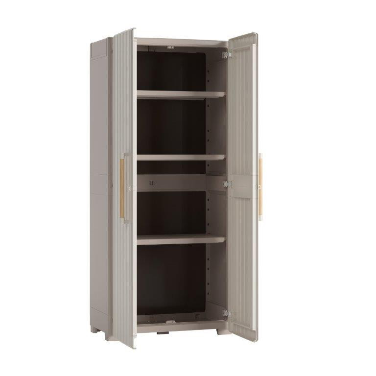 Skriňa Keter Groove High vám zaistí dostatok úložného priestoru na náradie, záhradné náčinie, pomôcky na upratovanie a ďalšie veci. Využijete ju ako v interiéri, tak v exteriéri. Táto elegantná a praktická skriňa perfektne doplní vybavenie vašej garáže, dielne aj záhradného domčeka. Drevené madlá a kovové pánty vám umožnia skriňu otvoriť doširoka, takže máte pohodlný prístup k uloženým predmetom.