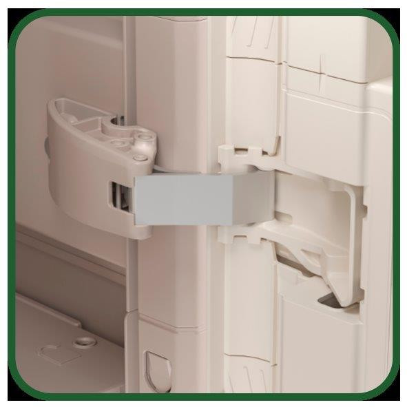 V prípade potreby skriňu uzamknete pomocou visiaceho zámku (nie je súčasťou balenia). Táto skriňa navyše odolá vode a vďaka spevnenému dnu a tyčke, ktorá vystužuje každú policu, je konštrukcia stabilná a bezpečná aj pri väčšom zaťažení.