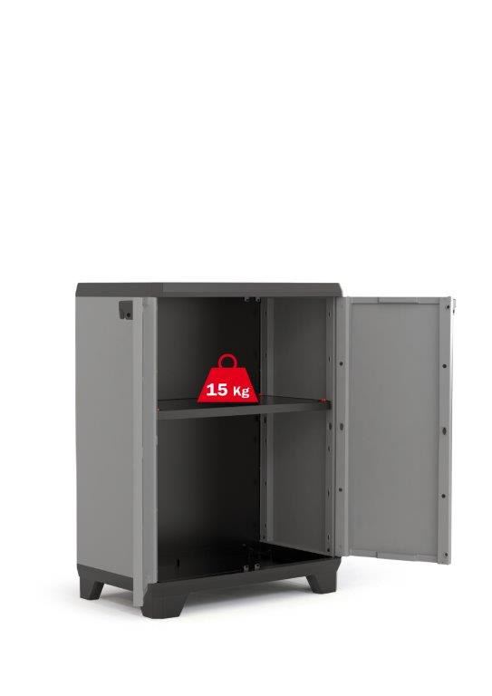 Menšiu úložnú skriňu Keter Stilo Low využijete v pivnici, v dielni, garáži, kôlni či na verande. Vnútri skrine nájdete 1 policu, ktorú môžete umiestniť tak, ako práve potrebujete. Bez obáv unesie až 15 kg. Montáž skrine je naozaj jednoduchá a rýchla, zaberie vám zhruba 10 minút. Na pevné oko na dverných madlách môžete umiestniť visiaci zámok (nie je súčasťou balenia) a skriňu zamknúť. Výšku nôh si môžete ľubovoľne nastaviť pomocou skrutkovacieho mechanizmu.