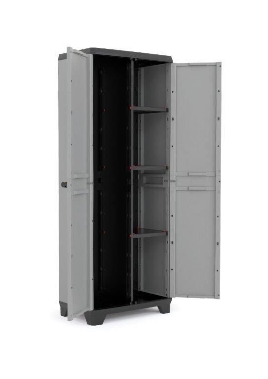 Keter Stilo Utility je skvelou voľbou do každého priestoru, kde potrebujete kombinovať klasické policové usporiadanie s otvoreným priestorom na dlhšie náradie. Pravá časť skrine obsahuje tri nastaviteľné police s nosnosťou 10 kg, zatiaľ čo ľavá časť ponúka dostatok miesta napríklad na metly, vedrá alebo hadice.
