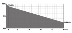 - dlhodobá spoľahlivosť – > 90% špičkového výkonu počas 10 rokov, > 85 % špičkového výkonu počas 25 rokov