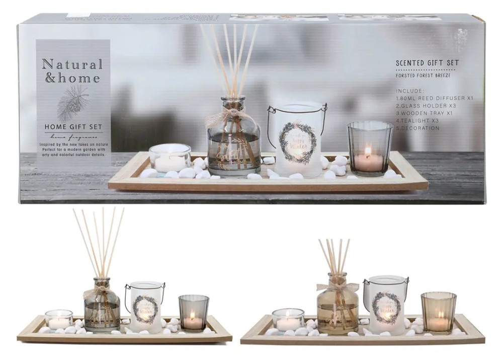 - Svietnik obsahuje difuzér s ratanovými tyčinkami, kalíšky na čajovú sviečku, sviečku a dekorácie