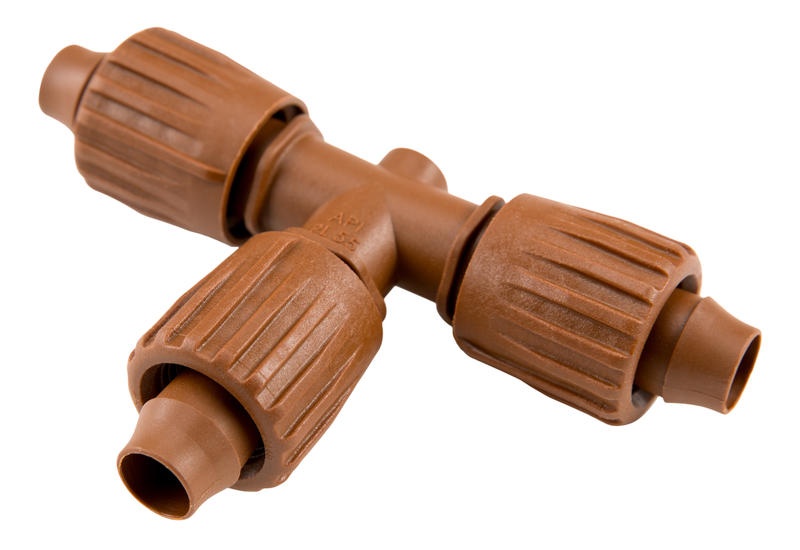PLD-LOC-TEE T-kus. Slúži pre spojenie kvapkového potrubia. Montáž prebieha vsunutím potrubia do spojky a zaistením objímkou.