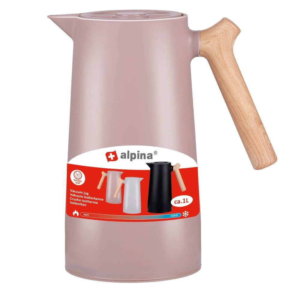 Udržte teplotu svojho obľúbeného nápoja pomocou termosky Alpina sobjemom 1 l. Na prvý pohľad vyzerá ako klasická kanvica alebo džbán. Uchopíte ju za madlo v drevenom dizajne. Ľahko ju prenesiete z kuchyne na stôl v obývacej izbe alebo napríklad na záhradu, kde pohostíte členov svojej rodiny či návštevu.