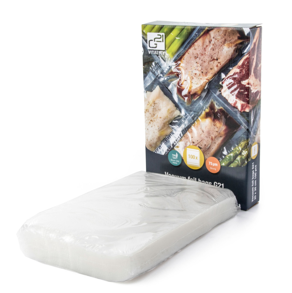 Vákuovacie vrecká G21 s rozmermi 20 x 30 cm sú vďaka svojej vysokej pevnosti a kvalitnému prevedeniu vhodné nielen pre predĺženie trvanlivosti potravín vákuovaním a ich uchovávanie v chladničke alebo v mrazničke, ale využijete ich aj k vákuovaniu surovín pre sous-vide varenie.