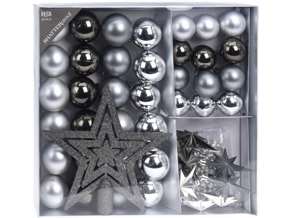Závesné ozdoby M.A.T. Group 385968 neodmysliteľne patrí k adventnému obdobiu, kedy vykúzli tú správnu vianočnú atmosféru pre prežitie sviatočných dní v kruhu vašich najbližších. V tejto sade nájdete 1 dekorovanú špičku na stromček a 44 ďalších ozdôb v tvare gule či hviezdy, ktoré sú opatrené háčikom pre ľahké a spoľahlivé zavesenie. Strieborné, čierne a šedé prevedenie umožní zladenie s inými dekoráciami, či už tiahnete k tradičnej alebo modernej vianočnej výzdobe.